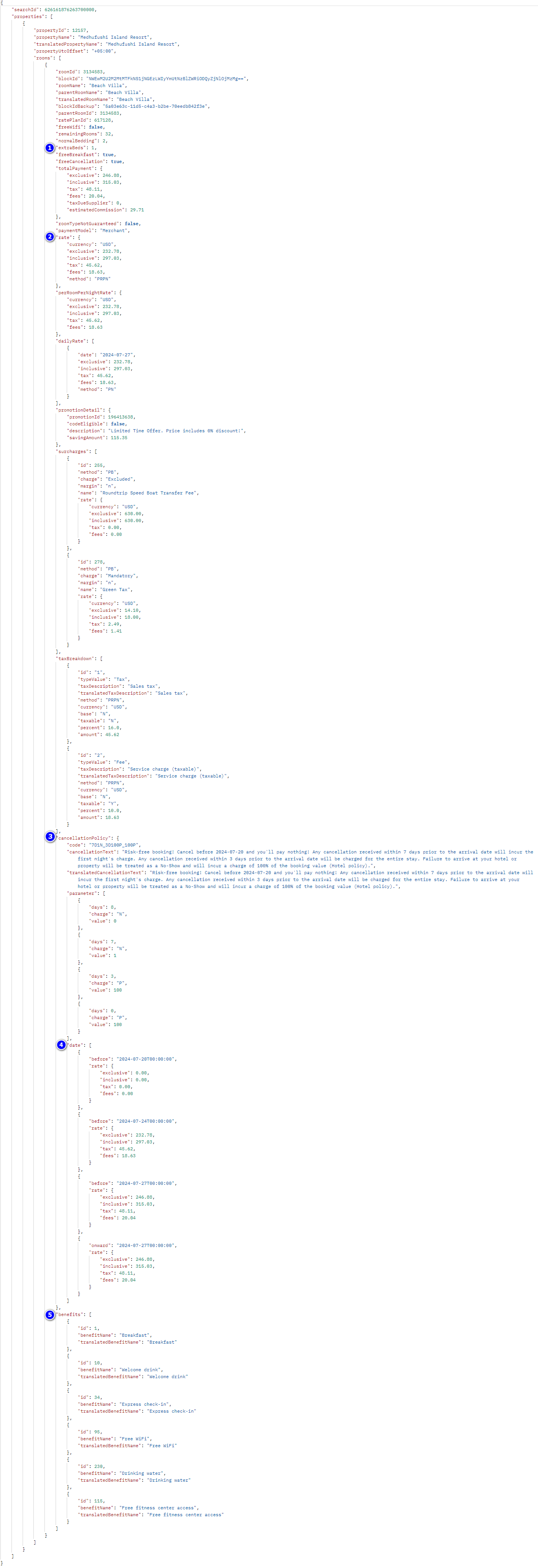 - 3.Cancellation policy indicated under "cancellationPolicy"