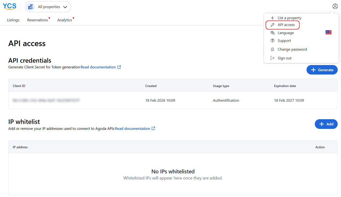 To authenticate your identity when connecting to Agoda, you will need to whitelist the IPs that you will be using for making API Calls, and use OAuth2.0 Authorization token when calling to Agoda APIs.